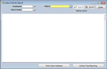 Worker Time is equivalent to Labor. Clicking the Labor Activity Search button at the bottom of the Resource Search window displays the Labor Activity Search window. You can use this window to find and display labor transactions entered through the Worker Time Reporting window, access the Work Order Notebook and the Worker Time Reporting window, and run external reports related to labor activities.
