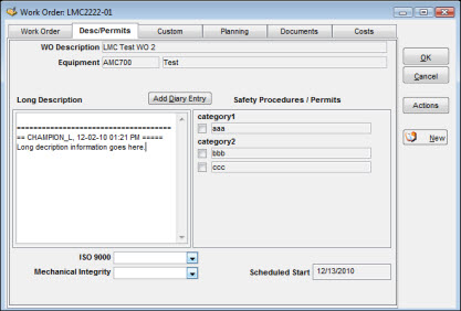 You can enter a long description and identify safety procedures and permits related to ISO 9000 and mechanical integrity on the Desc/Permits tab.
