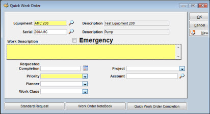Users throughout the facility can use the Quick Work Order function to enter a request if the work order has limited scope and does not require detailed planning. For a job that occurs repetitively, you can access a list of standard requests to copy information and eliminate redundant typing.
