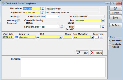 When finished, click the Quick Work Order Completion button. The Quick Work Order Completion window displays. |