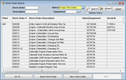 Using the Work Order Search window, you can search the work backlog for in-progress jobs and then select certain work orders for further processing. You can also enter a new work order or jump to the Event Notebook to enter a non-work order event that occurred.