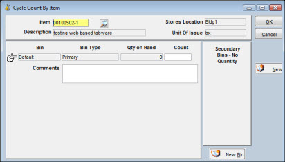 Enter the actual quantity on-hand in the Count box as recorded from a bin count. |