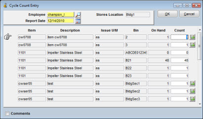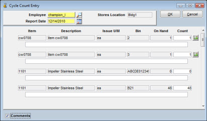 You have a choice of two windows when entering cycle count activity. The example shown above is the default window that displays when you select Cycle Counting from the Go To button on the Item Search window. If you want to enter Comments while entering Counts, you can select an alternate window by clicking the Comments checkbox at the bottom left. A new window displays showing a field for Comments, but the number of items displayed per page is lower.