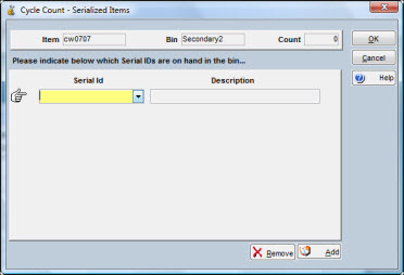 If you enter a Count for a serialized item that differs from the expected quantity on hand, the Cycle Count - Serialized Items window will open automatically and you will be required to Add and Remove serial numbers from the list to match the Count being entered for the item.