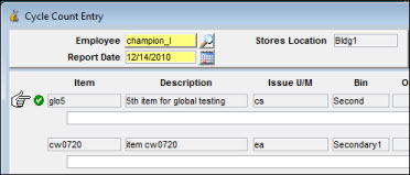Enter the actual quantities under the Count column as recorded from physical bin counts. As you proceed from one bin to the next, a green check mark displays at the left margin, providing a way to determine which bins on the page have been processed. |