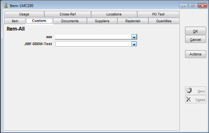The Custom tab displays user-defined fields for inventory items. The values displayed are unique to the particular item number while the labels are the same for all items. Custom elements are defined in the Setup module on the TabWare Power Panel. For more information on custom elements, contact your system administrator.