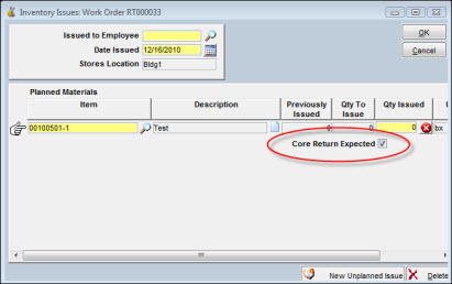 the Inventory Issues window displays a checkbox marked Core Return Expected for that line item. If that checkbox is selected, TabWare creates a repair log record at the time of the issue transaction when the stores clerk enters the requisition, the quantity to issue, and the employee to whom the item was issued.