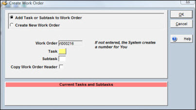 You can choose to either create a new work order or add to an existing work order as either a task or a subtask. Click the appropriate radio buttons and then click OK. |