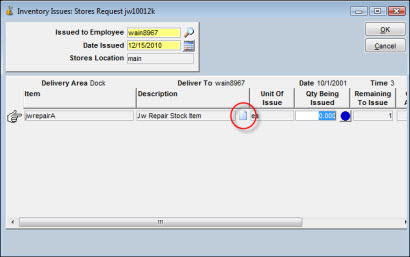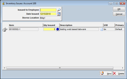 When materials have been withdrawn from stores, an attendant uses the Inventory Issues windows to record the transactions. The process takes less time if requesters have preplanned, creating requisitions for their needs. The cost of materials issued can be charged to an account, to a requisition/work order, or to a stores request. The issues process uses two windows.