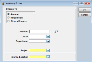 After selecting and entering values for Account, Area, Department, Project, and Stores Location (if applicable), click OK.