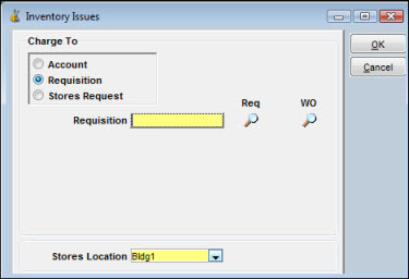 From the Inventory Issues window, select the Requisition radio button if you are issuing preplanned materials or issuing unplanned materials chargeable to a work order.