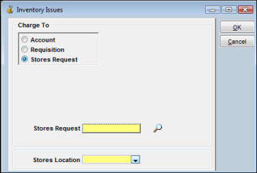From the Inventory Issues window, select the Stores Request radio button if you are issuing items to a Stores Request. Either enter the Stores Request number or click the search icon to the right of the field to search for the number. If applicable, enter the stores location.