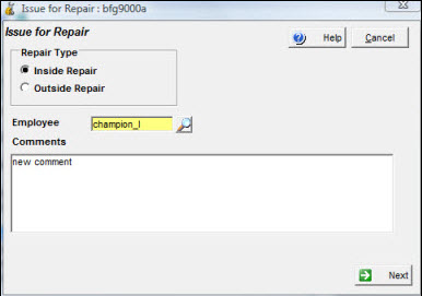 From the Repair Log Search window, highlight the row containing the item to be repaired and click the Issue for Repair button. |