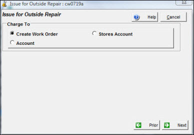 If you select Outside Repair and it is a serialized item, the wizard opens the Issue for Outside Repair window. Each of the Charge To options (Create Work Order, Account, and Stores Account) are secured options. If your userid does not have access to any of these options, you will not see them on this window. For non-serialized items, you are also given the option to Add to an Existing Work Order.
