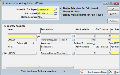 The second window displays showing preplanned items sorted by each delivery point on the requisition. Click one of the radio buttons at the top to adjust the search results display as needed. At the bottom of the window, TabWare shows the total number of delivery locations. To issue planned materials, enter Quantity Issued and click OK. To issue unplanned materials, click the New Unplanned Issue button and enter an item number and quantity issued. Click OK after entering the last unplanned item.