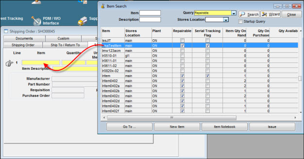 If a shipping order line has been copied from the Item Notebook, a requisition, or a purchase order, you can open the associated notebook by selecting the line on the shipping order and clicking the Go To button at the bottom of the window.
