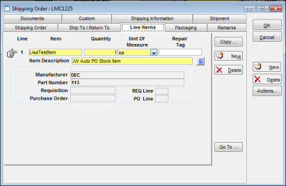 You can enter items to the shipping order by clicking the New button and entering them manually or by copying lines from the Item Search, the Requisition Search, or the Purchase Order Search windows. If you copy a permanent item, TabWare automatically copies the description and unit of measure.
