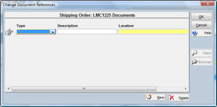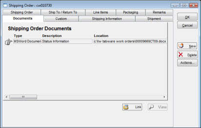 You can link drawings or other documents to a shipping order using the Documents tab. You can reference the documents to a location on a computer database or to a physical location, such as a file cabinet. Click the Link button to add or revise document links. To view a particular document, double-click the row or highlight a row and then click the View button.