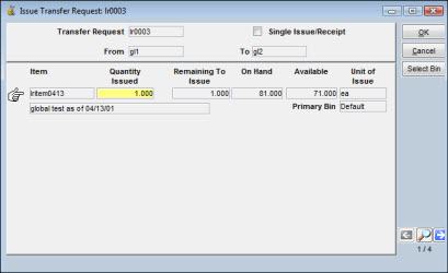 The Single Issue/Receipt checkbox defaults to the setting defined in the setup for Multiple Warehousing, but you can change it. For more information on the option Single Issue/Receipt, see Transfer Request Rules in Multiple Warehousing Setup Options. |