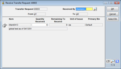 Unless the transfer of materials from one stores location to another is marked as Single Issue/Receipt, the quantity on hand at the destination stores location is increased by entering the quantity in the Receive Transfer Request window.