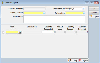If you need to transfer materials from one stores location to another, you can either click the Go To button from the Transfer Request Search window and select New Transfer Request, or you can perform a search for Transfer Requests, highlight the one you want to work with, and double-click. The Transfer Request window opens.