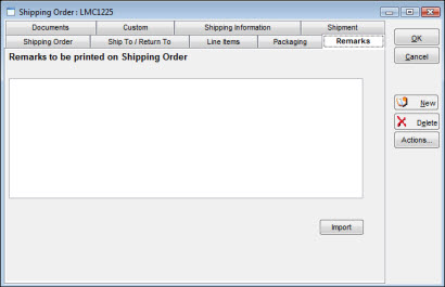 Comments entered on the Remarks tab are printed on the shipping order. You can click the Import button to import a text file into the Comments section of this tab.