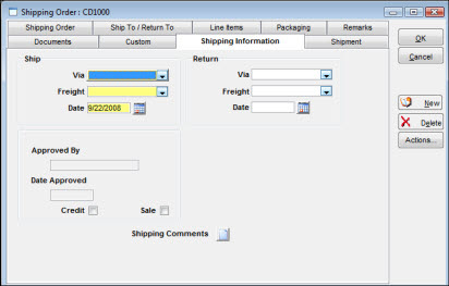 If the supplier should issue a credit memo as a result of this shipment, select the Credit checkbox. If the shipment is leaving your facility to be sold and your accounting department should expect payment, select the Sale checkbox. Only one of these boxes can be checked on a shipping order.