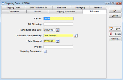 The Shipment tab, which is usually the last tab to be completed, contains information about the actual departure of the shipment. The carrier, date shipped, and Shipment Completed By fields must be entered once the shipment has been approved. The bill of lading number, scheduled ship date, and Pro Bill can be entered to provide more complete documentation.