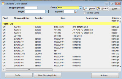 The navigation buttons at the bottom of the Shipping Order Search window allow you to access the Shipping Order, Supplier, Requisition, Purchase Order, and Item Notebooks as well as the Repair Log. You can also select one or more lines from the search window and right-click to jump to any of these notebooks. You can also create a new shipping order, approve existing shipping orders or, by clicking on the Actions button, reject, approve, cancel approval, forward, or print a shipping order.