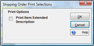 Unless you direct the print output to another printer, the shipping order prints at the printer designated in Inventory Setup as the default shipping order printer (usually a printer in the warehouse from which the item is to be shipped). A hard copy of an approved shipping order printed in the warehouse authorizes material to leave the plant. In addition, the hard copy may be used as a packing slip and accompany the material. If Print Item Extended Description is checked, the shipping order includes each item’s extended description.