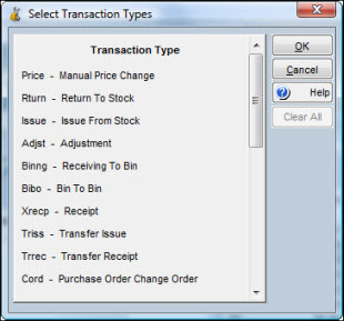 The Stores Activity Search window contains a search icon for selecting transactions types you want included in the search. Click the icon to display a list of valid transaction types based on your plant’s setup. Hold the CTRL key down to individually select multiple entries. Click the Clear All button to remove all your selections. The selected transactions will be included in the search. If none are selected, then all will appear on the search.