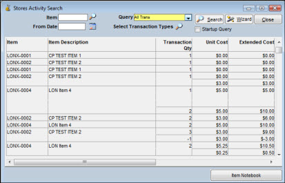 Use the Stores Activity Search window to find stores transactions previously entered through Inventory windows. From the displayed results, you can jump to the Item Notebook, run an external report, or print the results to a network printer. You have the option of selecting certain transaction types, using a full or partial item number as selection criteria, and specifying a Start From transaction date.