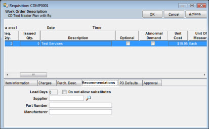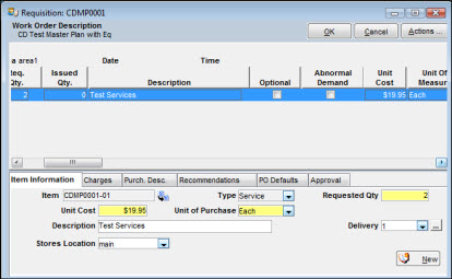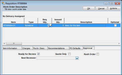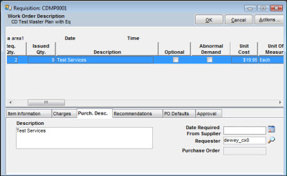 Use this tab to further describe the item being ordered. It is always available to requisitions classified as add to reorder and is also available for other requisition types where the item is permanent and item type has been defined as always outside purchase and allow entry of purchase descriptions.