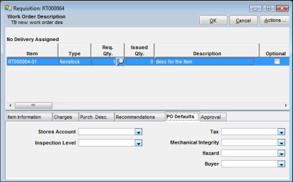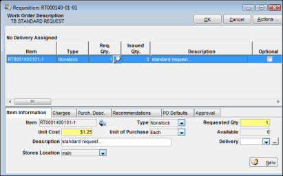 If the item is Permanent, this field defaults to the Purchasing Specifications values shown on inventory records. The field can be edited, but any changes made do not update the values in the inventory records. The updated text applies to this single requisition and to the purchase order it is later assigned to.