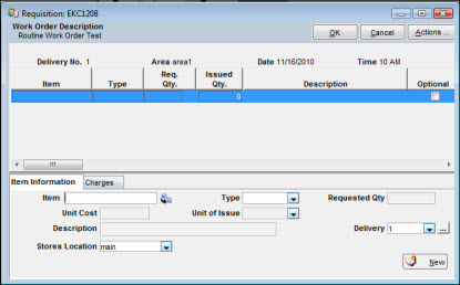 The line item window consists of two main sections: the top section displays an item list showing descriptions and quantities for all line items currently assigned to the requisition; the bottom section provides a data entry area for adding a new item to the requisition or updating an existing item. At the top of the main window is an Actions button that provides access to other requisition functions.