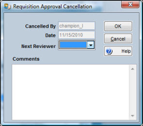 Highlight one or more records, click the Go To button, and select Cancel Approval from the dropdown list. The Requisition Approval Cancellation window displays. |