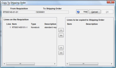 To copy all lines to the shipping order, click the double arrow button. All items appear on the right side of the window, ready to be copied to the new shipping order. To copy a single line to the shipping order, highlight the line to be copied and click the single arrow. When the required lines have been copied to the right side of the window, click OK to copy them to the shipping order.
