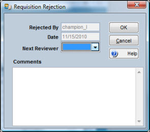 Highlight one or more records, click the Go To button, then select Reject from the dropdown list. The Requisition Rejection window displays. |