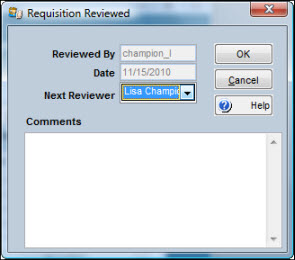 Highlight one or more records and click the Review button. The Requisition Reviewed window displays. |