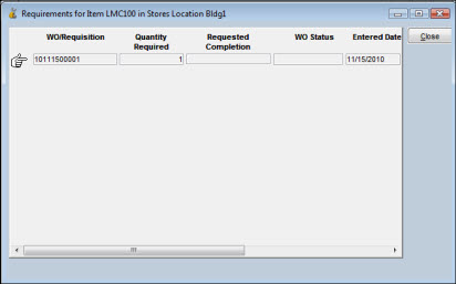 If your plant is using the Multiple Warehousing feature, you may have an alternative to placing a reorder. If the need for the items is immediate, you may decide to transfer items from other stores locations within the plant. The View Requirements window shows you the work order status, the requested completion date, the quantity required, the requested delivery date, and other pertinent information.