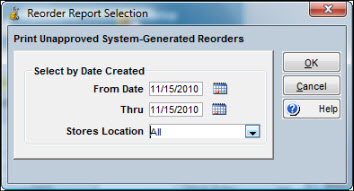 You can print information about unapproved system-generated reorders for a designated timeframe from the Go To-Reorder Report selection. If your facility is using Multiple Warehousing, you can print this information for any stores location or for all locations.