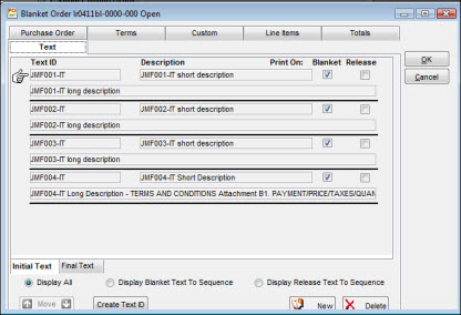On the blanket purchase order Text tab, select the Display Blanket Text to Sequence radio button. |