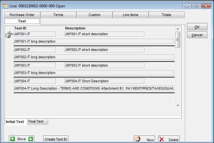 Click OK. The window closes and the newly-created Text ID is passed back to the Text tab, where it is assigned to the purchase order. |