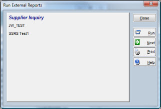 Click the Reports button. The Run External Reports window opens showing the list of reports that have been written for this module. |