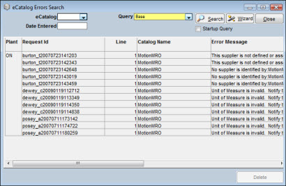 The eCatalog Error Search window is accessed from the Purchase Order Search window. This window allows the individual responsible for managing the TabLink suppliers to query against any of the rows that are in error from the TabLink process. Depending on the error, the individual can make the correction within TabWare or, if applicable, work with the supplier eCatalog site to make the correction on their end.