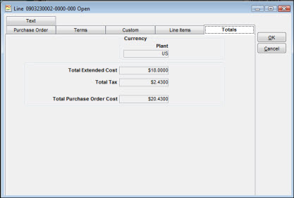 The Totals tab in the Purchase Order Notebook displays accumulated costs from line items entered through the Detail panel of the Line Items tab and displays three totals: