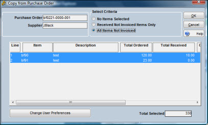 From the Copy from Purchase Order window, click the Change User Preferences button. |
