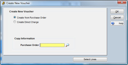 If you selected the option Create from Purchase Order, you must enter a Purchase Order number in the Copy Information section. After entering a number for an issued purchase order, you can then select line items from the purchase order for processing.