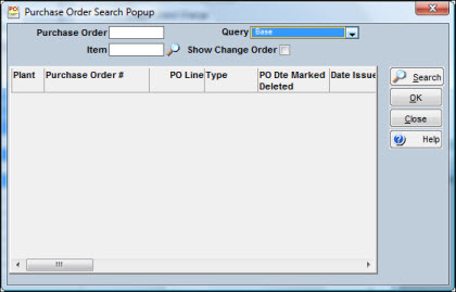From the Create New Voucher window, enter a purchase order number. Optionally, click the search icon to open the Purchase Order Search Popup window and perform a search. |