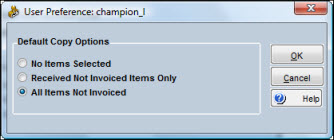 The User Preference window allows you to set Default Copy Options for use with the Copy from Purchase Order window.